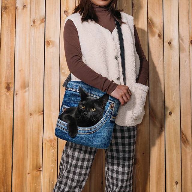 Cute Black Cat Denim Print Crossbody Bag – Casual Women’s